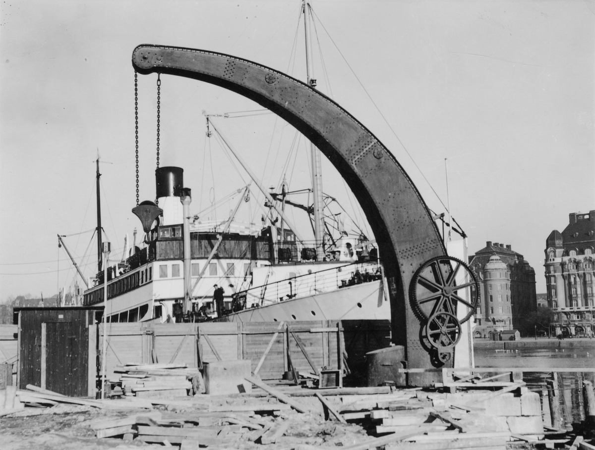 Lyftkranen vid Nybrokajen 1938. Tillverkad av Ludvigsbergs Mekaniska Verkstad. Kranen kunde lyfta 10 ton.