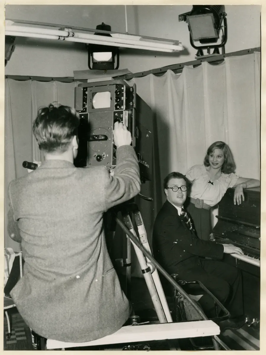 Televisionskamera på Kungliga Tekniska Högskolan vid sändning till mottagare på Tekniska museet i Stockholm den 2 juni 1949. Povel Ramel framför kameran.