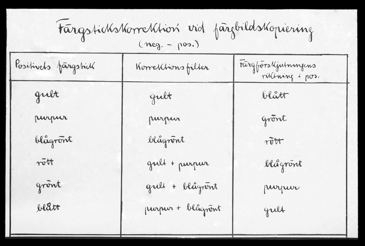 Skioptikonbild från institutionen för fotografi vid Kungliga Tekniska Högskolan. Använd av professor Helmer Bäckström som föreläsningsmaterial. Bäckström var Sveriges första professor i fotografi vid Kungliga Tekniska Högskolan 1948-58. Motiv föreställande "Färgstickskorrektion vid färgbildskopiering (neg. - pos.)" För mer info se: Bäckström, Helmer. Fotografisk Handbok. Andra omarbetade upplagan. Natur och Kultur. Stockholm. 1958-59. Kap. 132 s 992 och följande. "Direkta substraktiva metoder med material enligt treskiktsprincipen. Negativ-positiv-förfaranden."