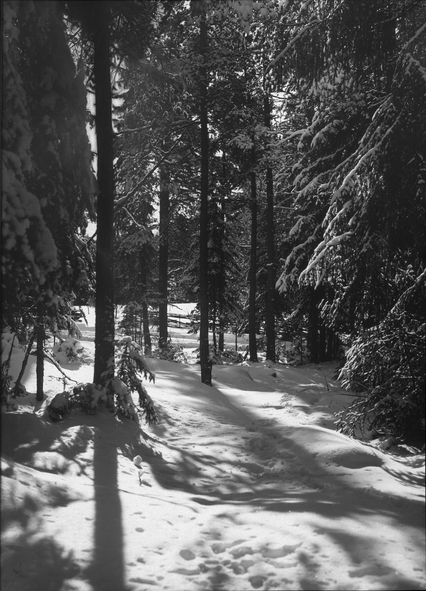 Fönsterbild med motiv av vinterlandskap. Troligen i Hedemoratrakten.