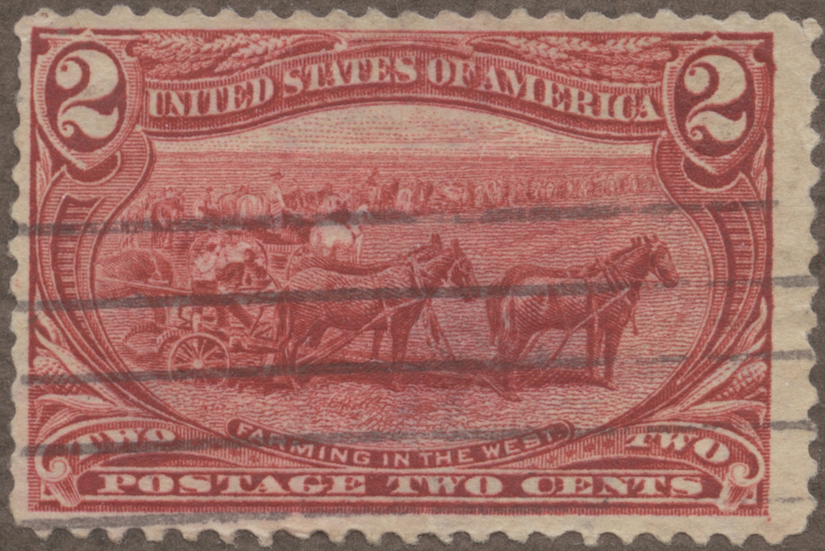 Frimärke från U.S.A., 1898. Motiv av Amerikansk jordbruk i de västliga prairie stater. -Plöjning- (efter fotografi) "Serie: Trans-Mississippi "Omaha"- Utställningen 1898