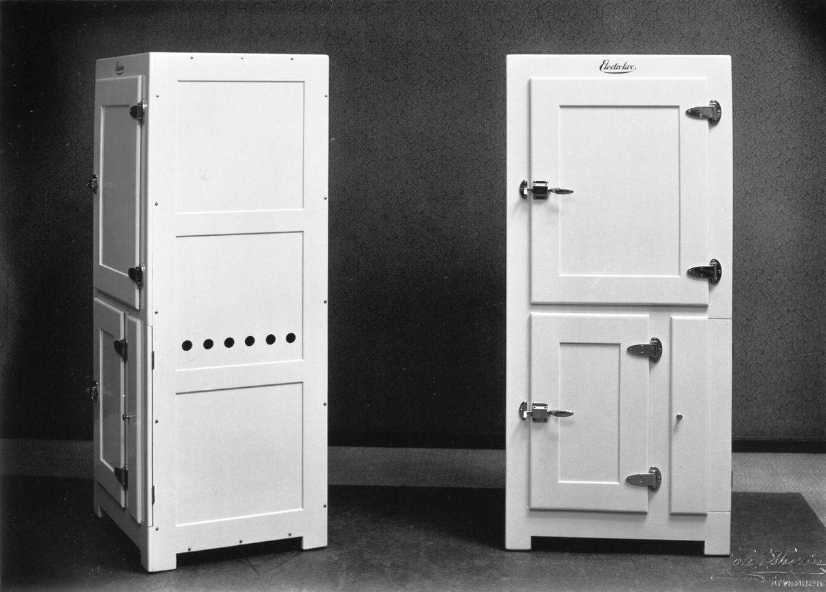 Beteckning K8. 2 st kylskåp i samma bild fotograferade framifrån och från sidan. Båda skåpen har två kylskåp i samma hölje.