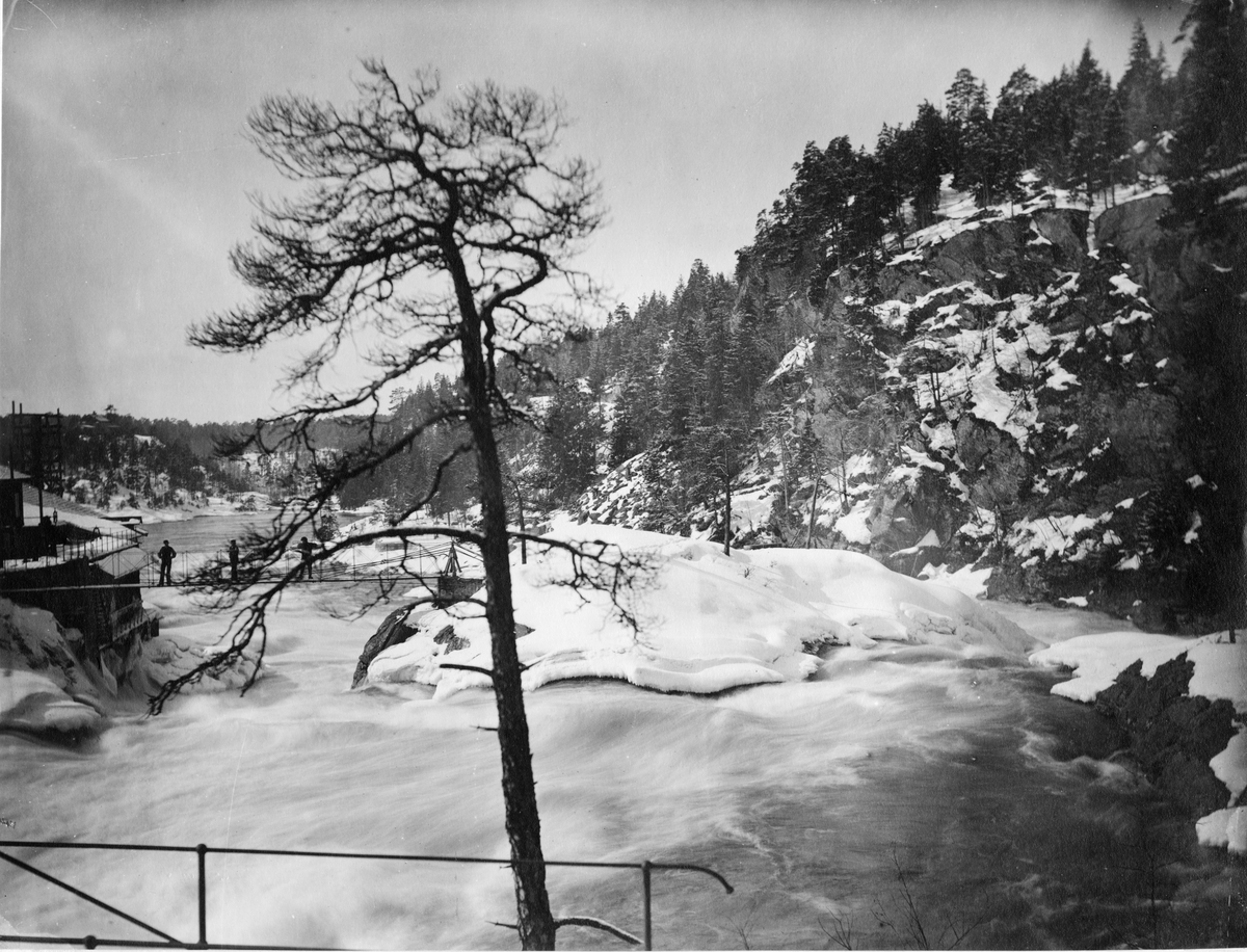 Trollhättan. Övre fallen från Gullöbron i Göta Älv.