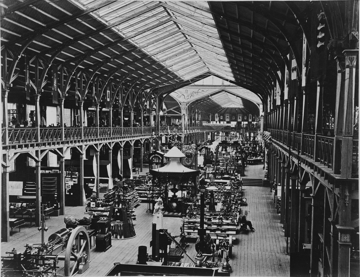 Industriutställningen i Stockholm 1866. Interiörbild från maskinhallen som var belägen i Kungsträdgården i Stockholm.