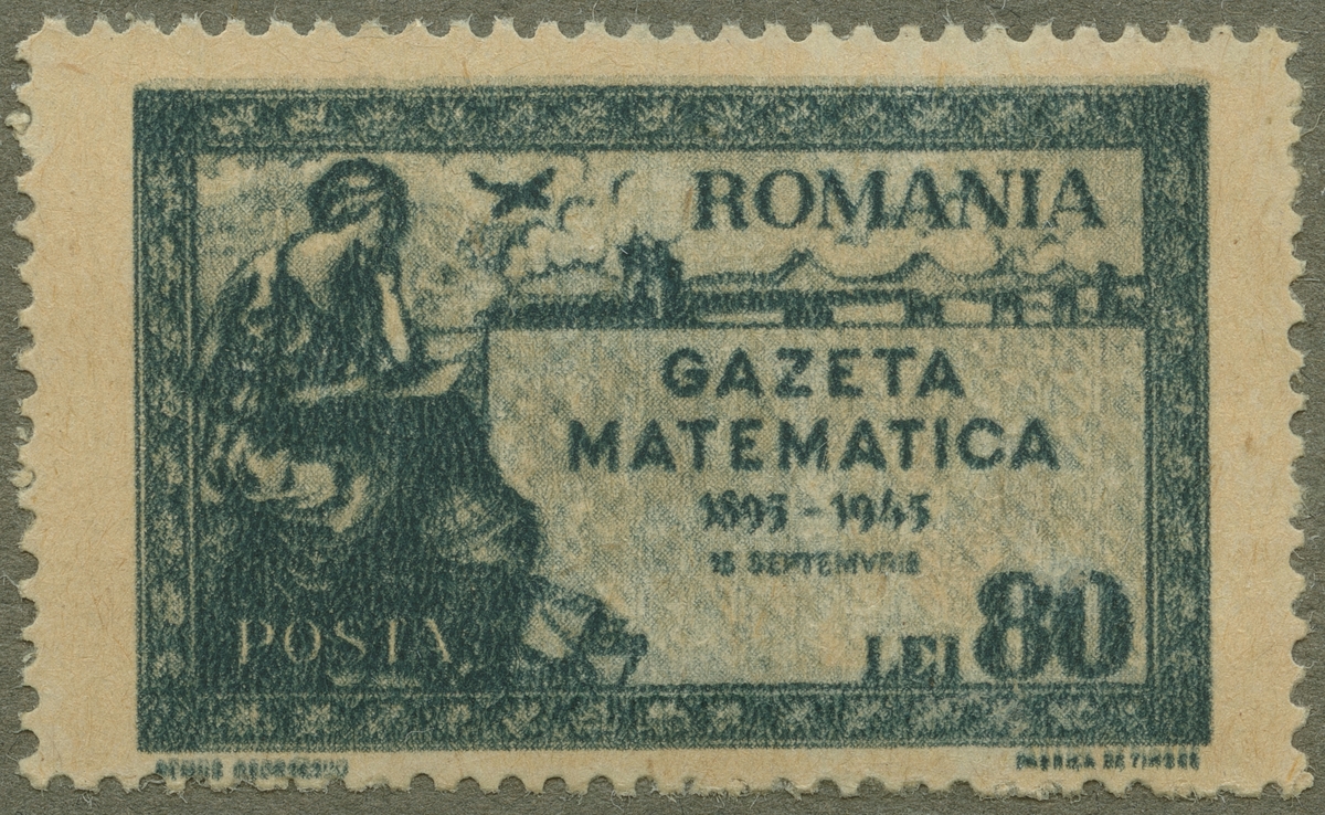 Frimärke ur Gösta Bodmans filatelistiska motivsamling, påbörjad 1950. Frimärke från Rumänien, 1945. Motiv av "Gazeta Matematica" matematisk tidskrift i Rumänien. Tidskriftens 50-årsjubileum."