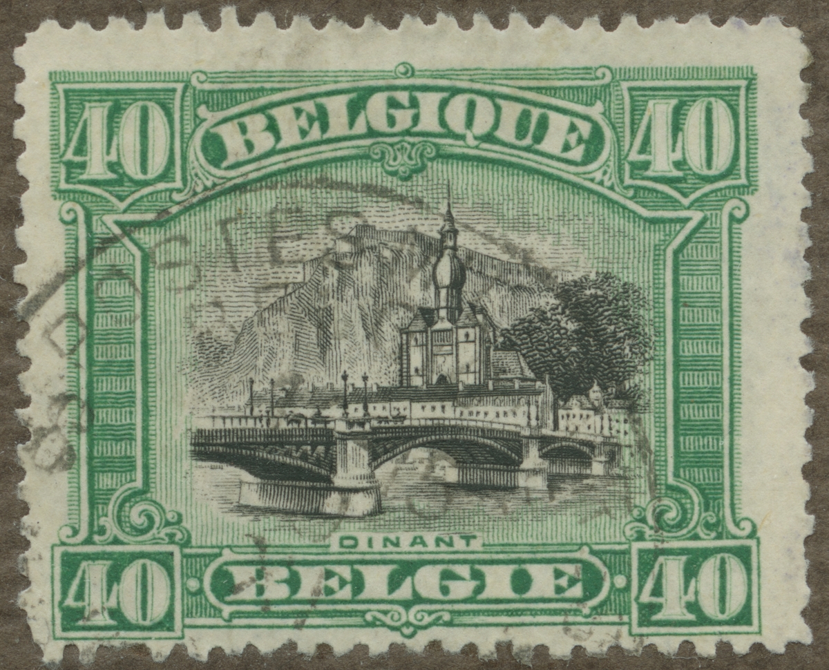 Frimärke från Belgien, 1916. Motiv av Bro i staden Dinant