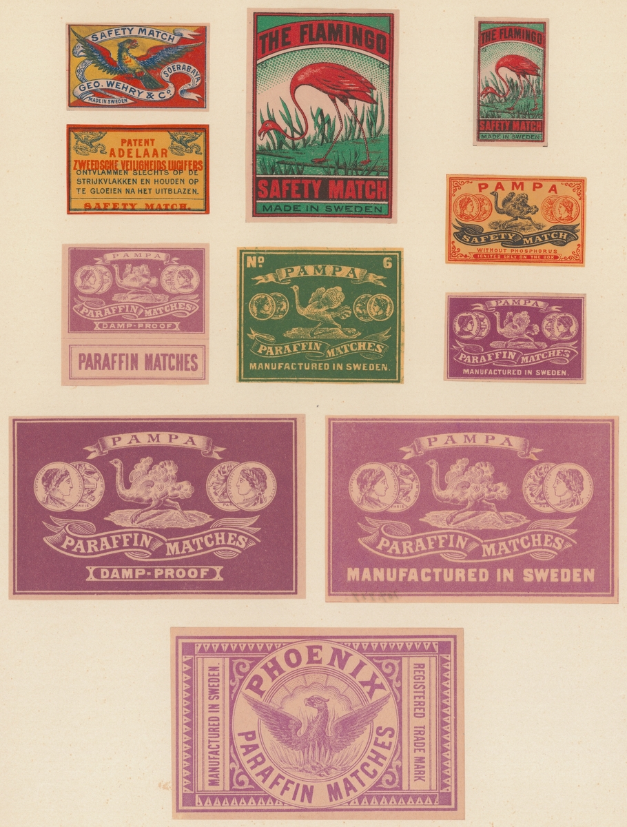 Etiketter för tändsticksaskar, från Svenskt Industri- och Handelsmuseum.