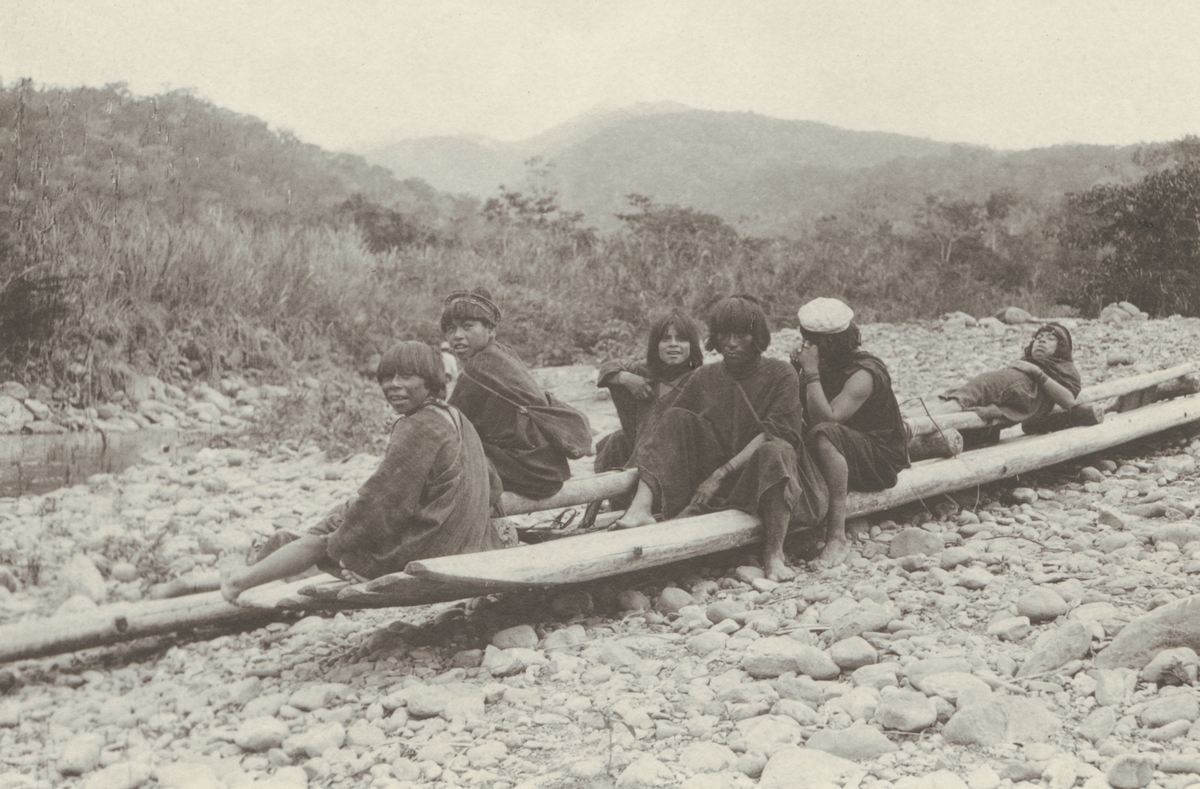 Fotografi från kuvert märkt med "Ernst Nordenskjöld". Motiv av män och pojkar som sitter på kanot på strand i djungel.