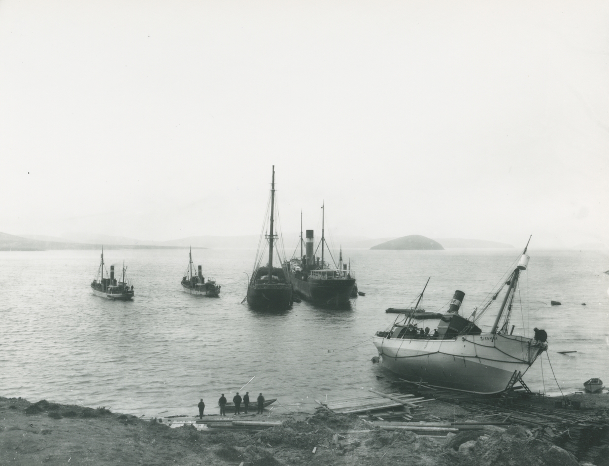 Bild från expedition i Antarktisområdet. Motiv av valfångaren "Ramna" på strand vid New Island Station, Falklandsöarna.