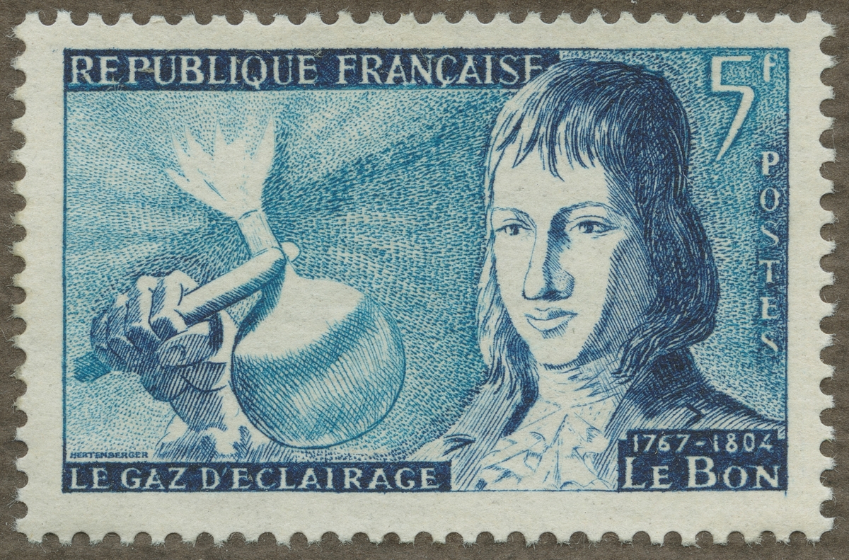 Frimärke från Frankrike, 1955. Motiv av Fransmannen Philippe Le Bon (1767-1804) Lysgas framställdes av Le Bon i en flaska ur ved genom torrdestillation. -"Serie: Uppfinnare-"