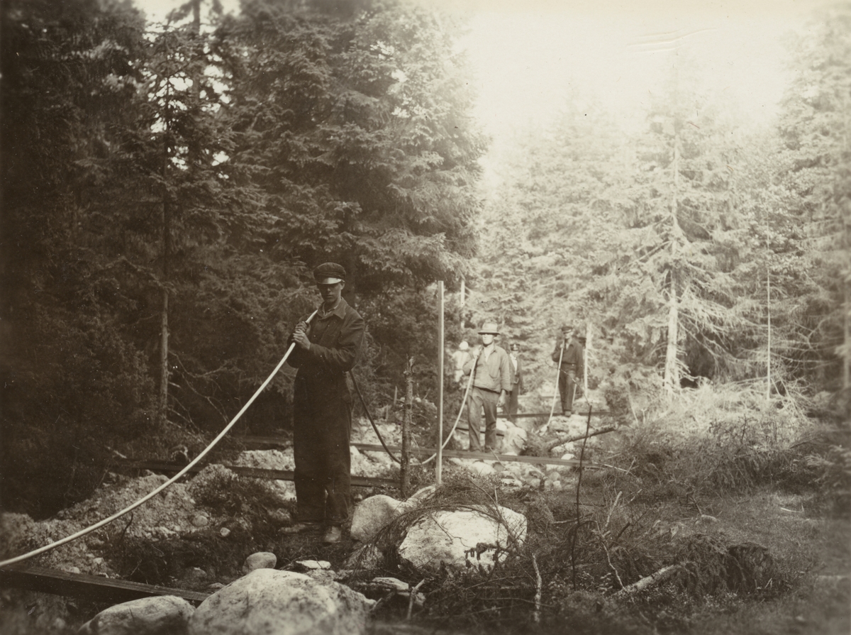 Finnvikskabeln. Kabelläggning vid Räfsnäs. Ur albumet Kabelarbetet Hjälmsälra (Hjälmsättra) - Norrtälje - Finnviken utfört under sommaren 1928.
