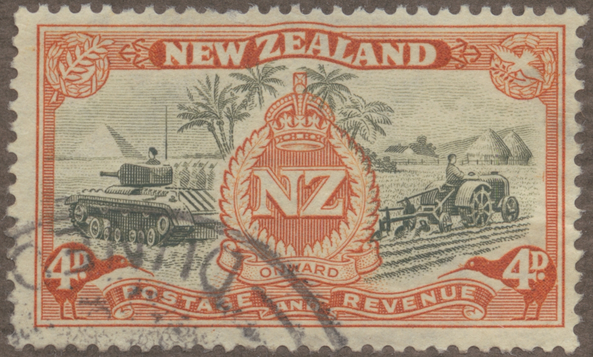 Frimärke från New Zealand, 1946. Motiv av Motorplöjning (mitten) New Zealands transatlantiska arméns emblem. -Minne av freden efter Världskrig II-
