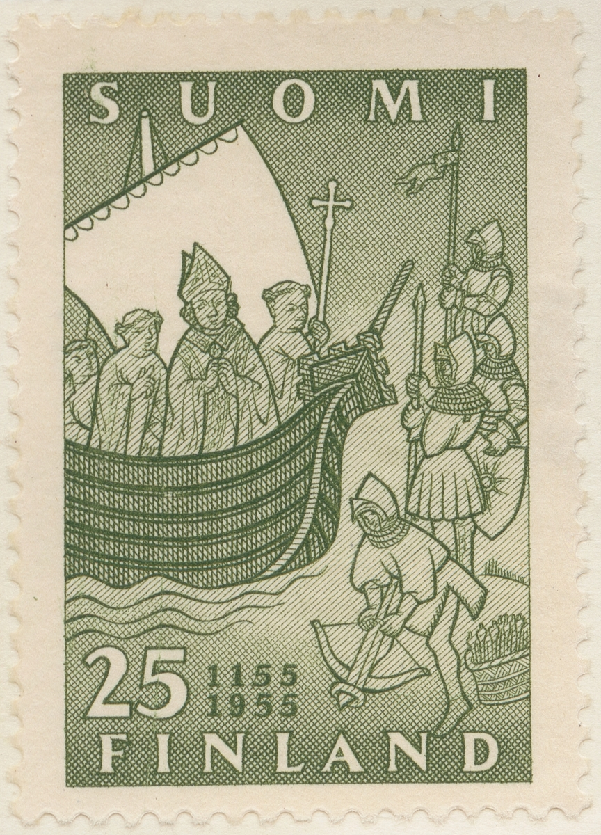Frimärke från Finland, 1955. Motiv av Erik den Helige:s Korsfartyg till Finland år 1155. -800-årsminne av Finlands omvändelse till kristendomen: 1155-1955.