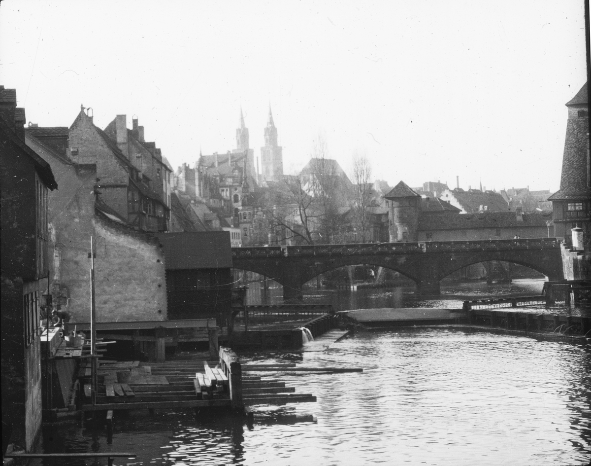 Skioptikonbild med motiv av Nürnberg vid floden Pegnitz.