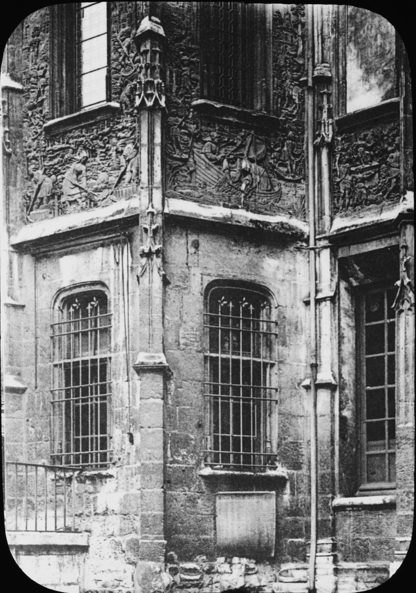 Skioptikonbild med motiv av Hôtel de Bourgtheroulde, Rouen. Bilden har förvarats i kartong märkt: Resan 1906. Rouen 5. VII.. Text på bild: "Hotel de Bourgtheroulde"