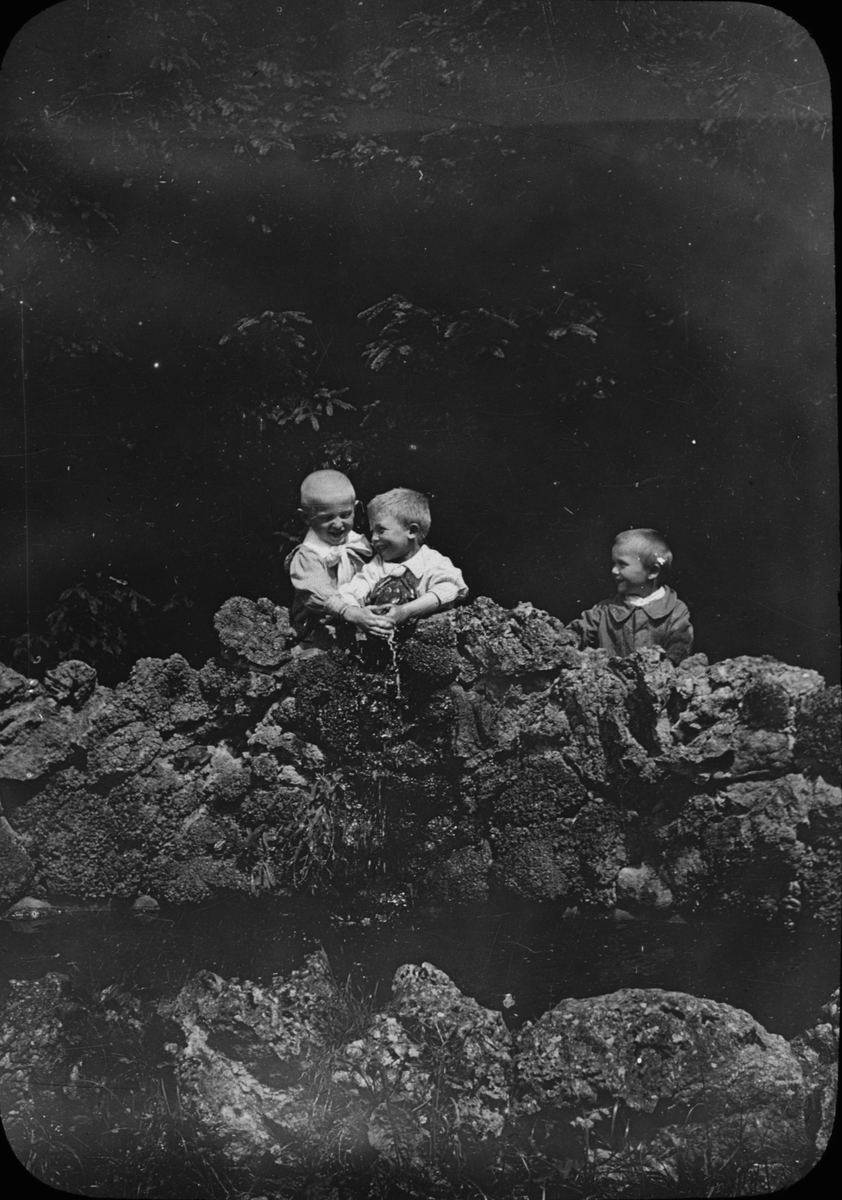Skioptikonbild med motiv av tre små lekande pojkar.