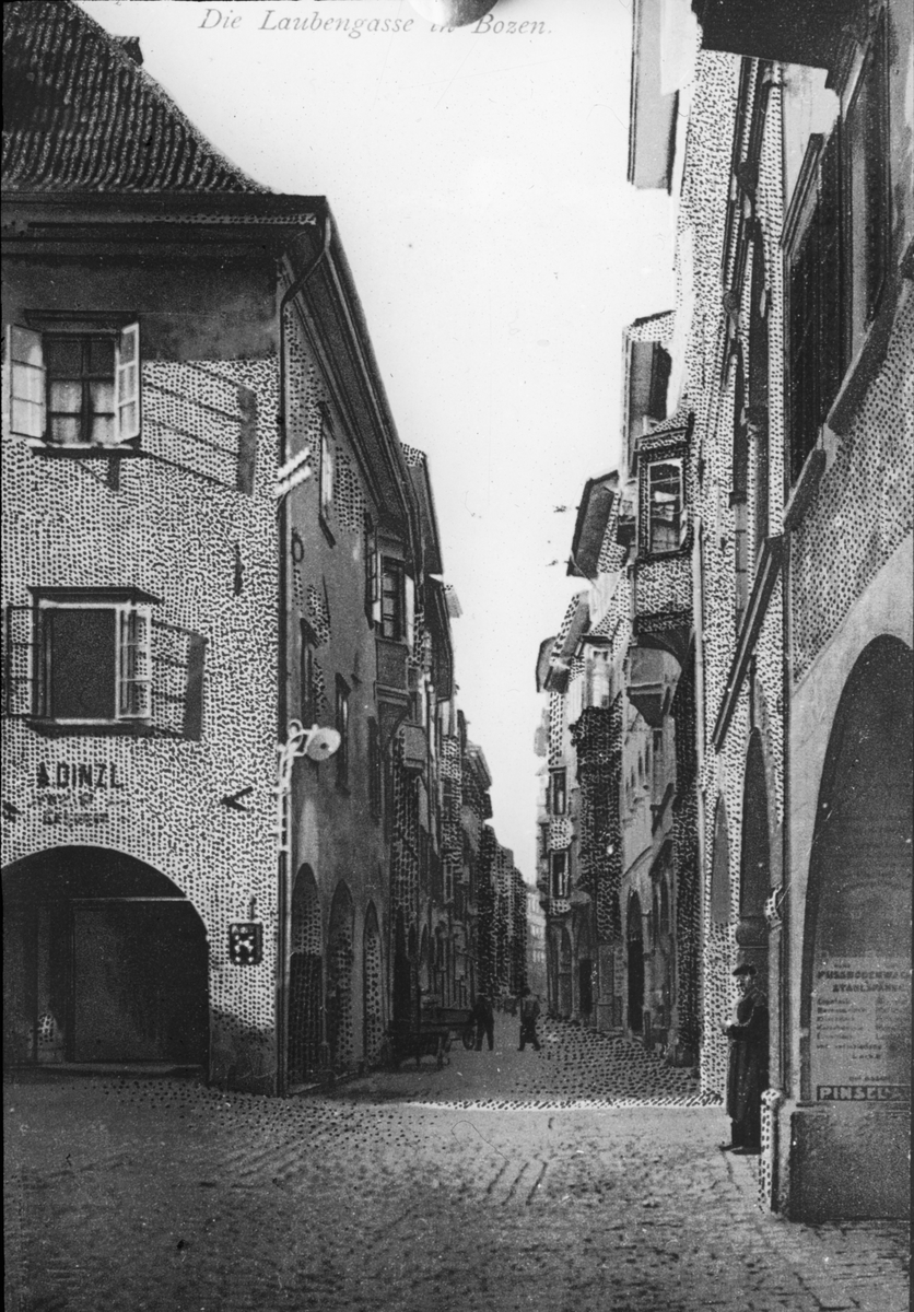 Skioptikonbild, vykort med motiv från gata i Bozen.