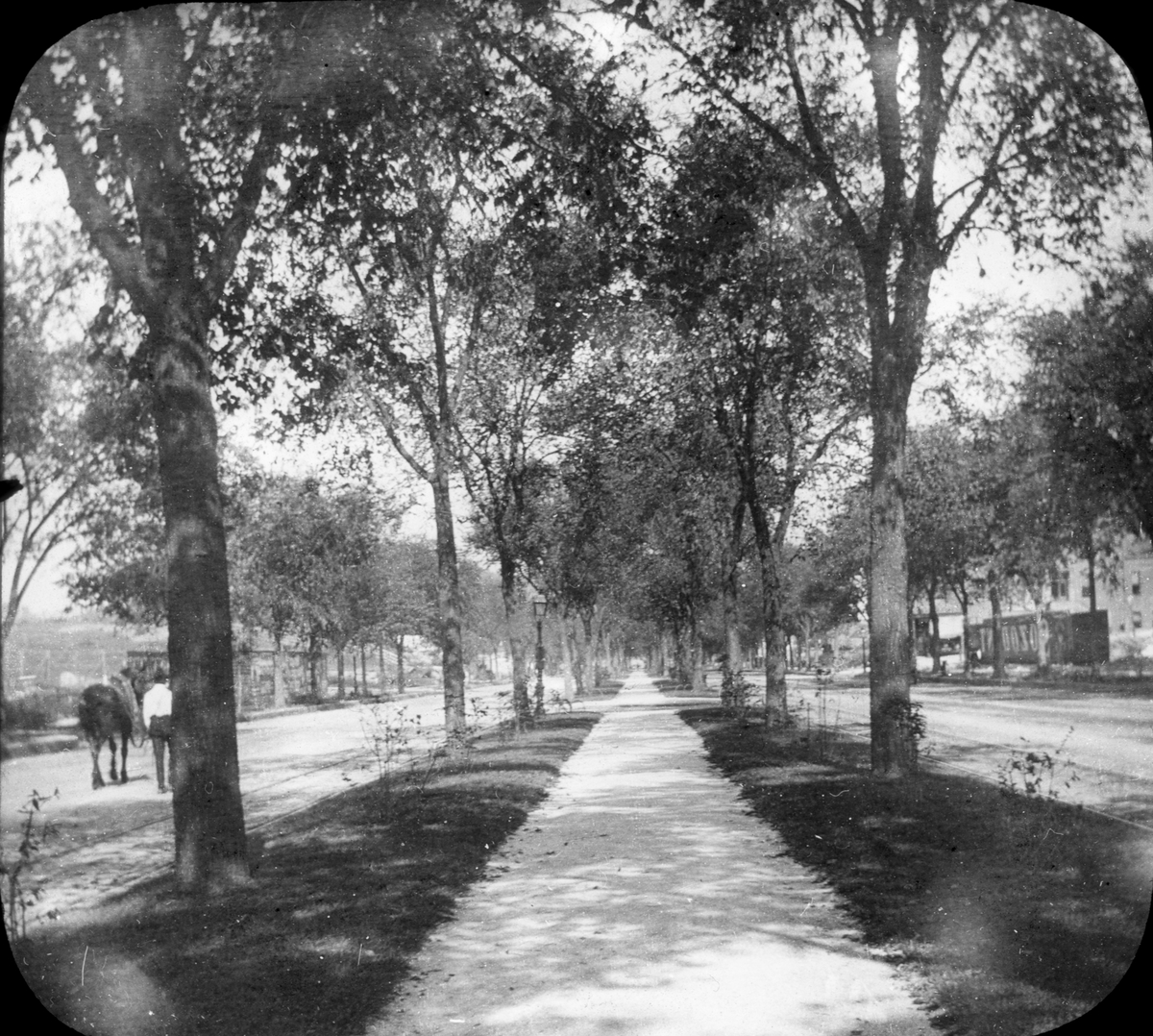 Skioptikonbild. Allé i på okänd ort. Bilden är spegelvänd. Troligen i USA.