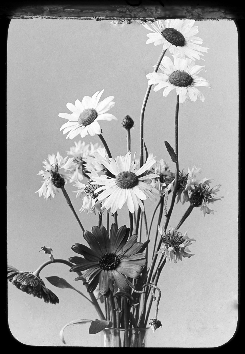 Skioptikonbild från institutionen för fotografi vid Kungliga Tekniska Högskolan. Använd av professor Helmer Bäckström som föreläsningsmaterial. Bäckström var Sveriges första professor i fotografi vid Kungliga Tekniska Högskolan i Stockholm 1948-1958. Motiv föreställande blommor i vas. På bilden står skrivet: Ortokromatisk plåt med gulskifva.