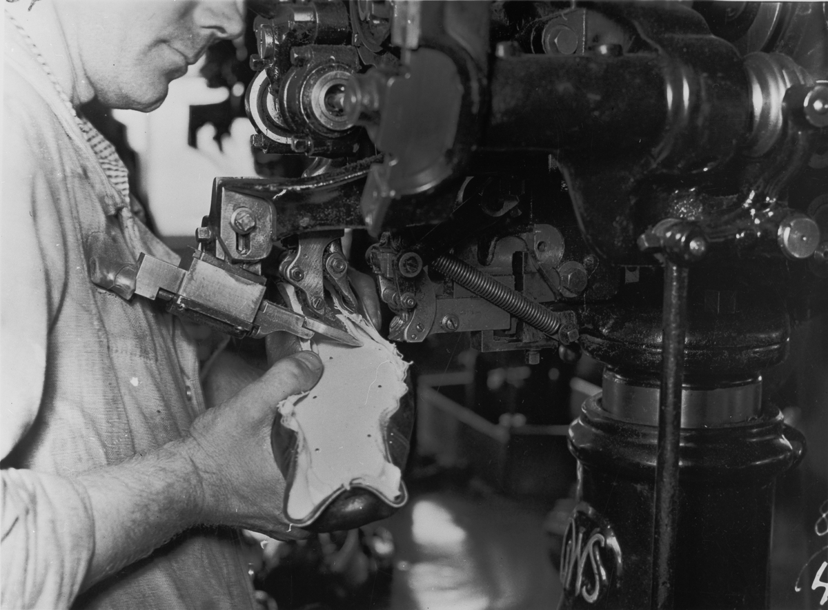 Sidorna "pinnas" d.v.s. skinnet sträckes ytterligare och fästes vid lästen. Genom ångning har skinnets töjbarhet ökats.