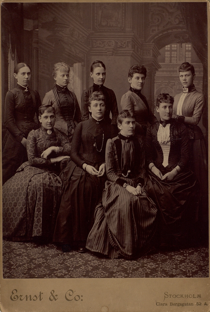 Allmänna Telefonbolaget, Malmskillnadsgatan, år 1887. Övre raden från vänster fr Elly Pegelow, fr H.Hörlin, fr Granat, fr G Sanden gift Celion, fr Ebba Lundberg. Nedre raden från vänster fr Gerda Beijerhjelm, fr Ida Pegelow gift med H T Cedergren och fr Anna Lenni gift med Knut Eriksson.
