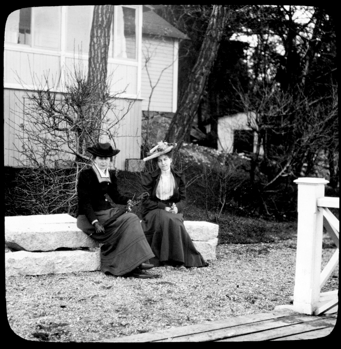 Skioptikonbild från institutionen för fotografi vid Kungliga Tekniska Högskolan. Motiv föreställande två kvinnor som blickar in i kameran. Bilden är troligen tagen av John Hertzberg under en resa i Europa.