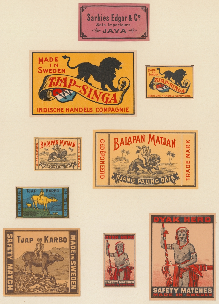 Etiketter för tändsticksaskar, från Svenskt Industri- och Handelsmuseum.