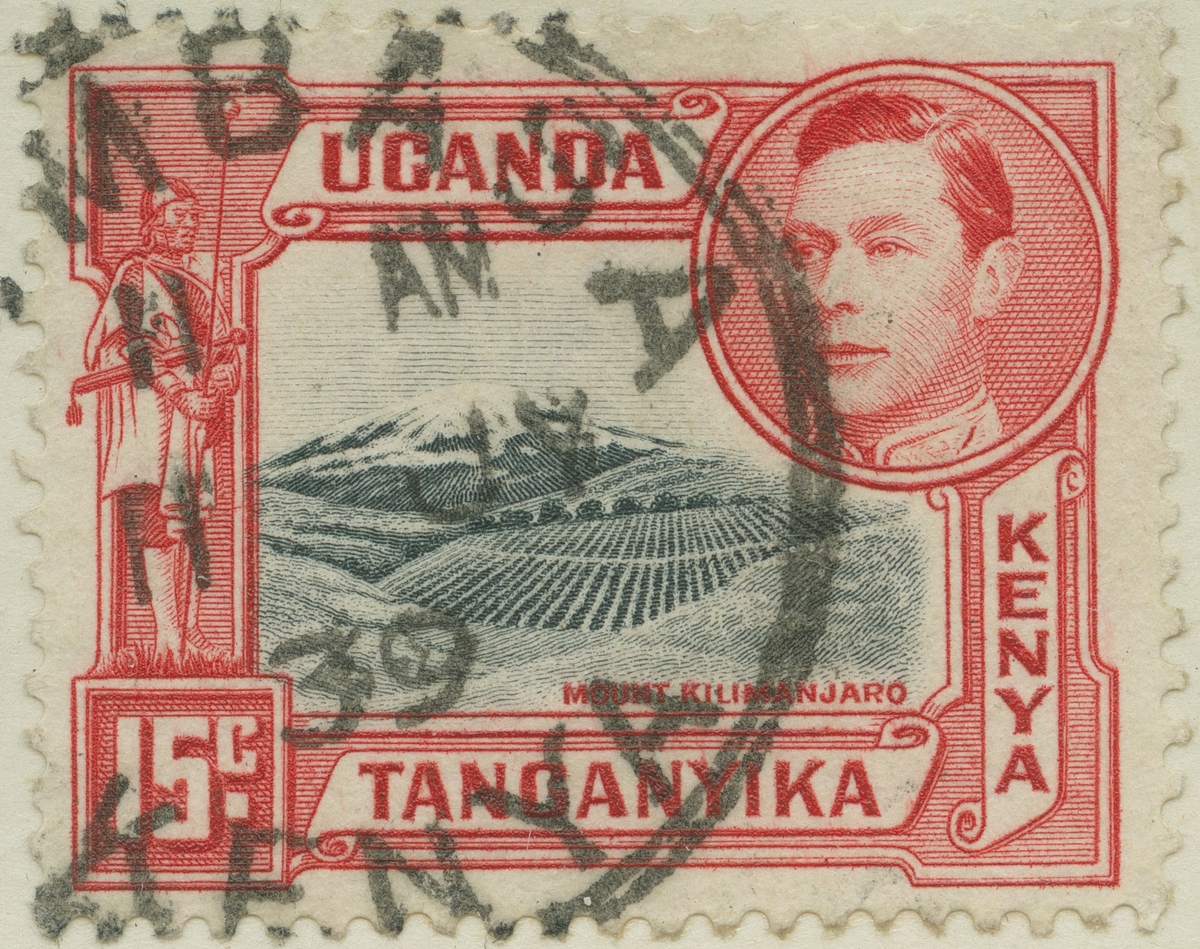 Frimärke ur Gösta Bodmans filatelistiska motivsamling, påbörjad 1950. Frimärke från Uganda Br. Afrika, 1952. Motiv av Afrikanskt landskap med Kilimanjaro snöberg i fonden-- Kung George VI. ": Uganda, Kenya, Tanganyika"