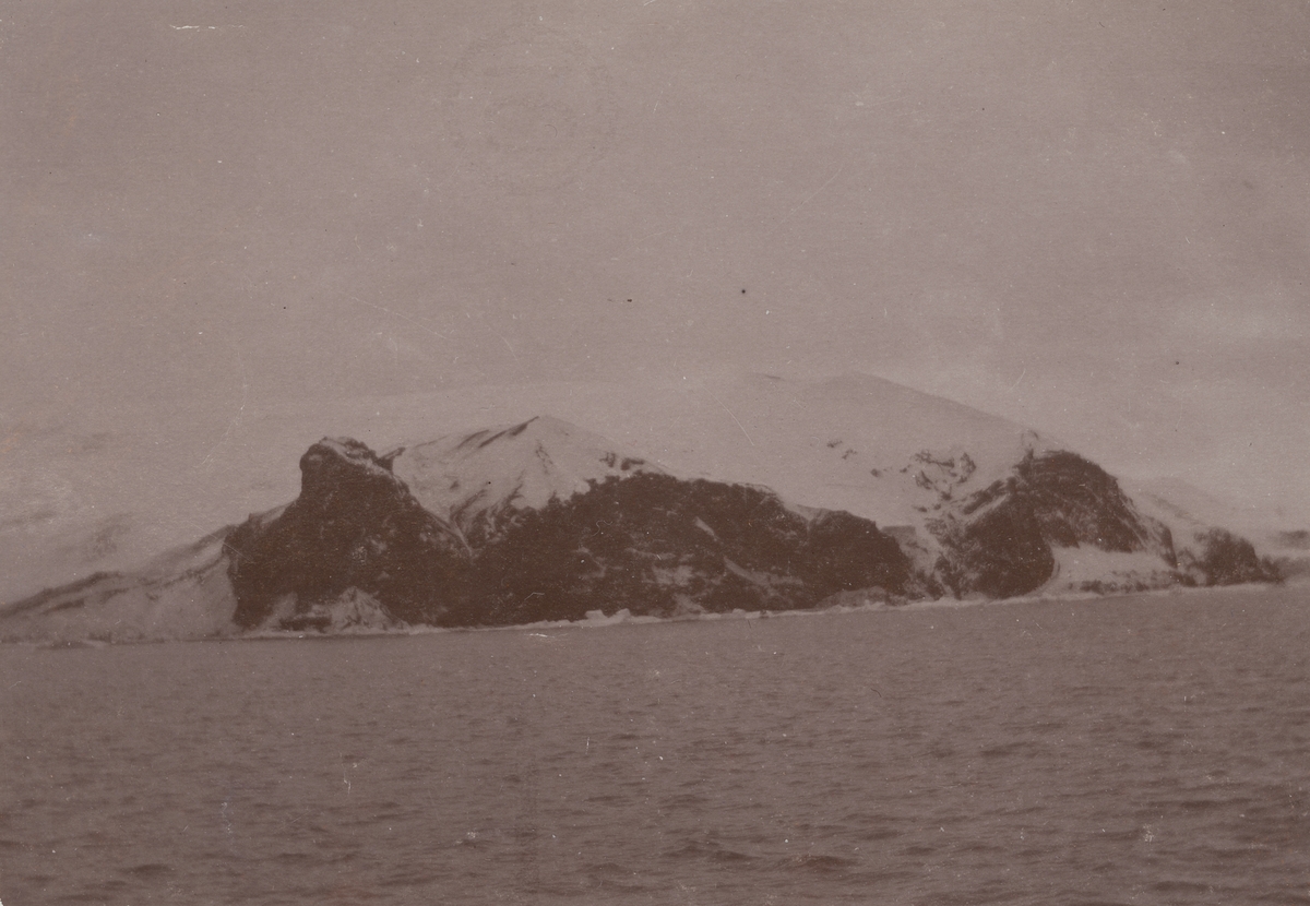Fotografi från första svenska Antarktisexpeditionen 1901-1904. Vy över hav och snötäckt berg.