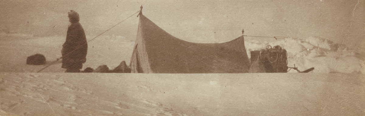 Fotografi från första svenska Antarktisexpeditionen 1901-1904. Motiv av man som står utanför ett tält i ett snölandskap.