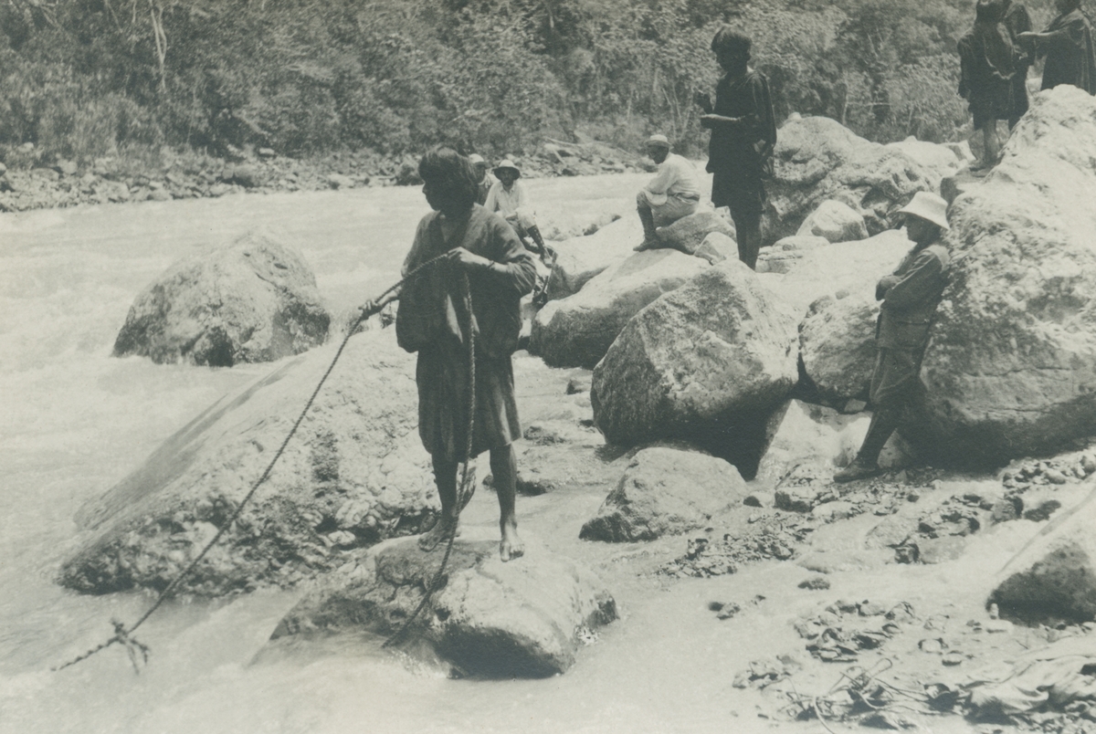 Fotografi från expedition till Peru 1920. Motiv av ett antal personer som står på klippor bredvid flod i djungeln.