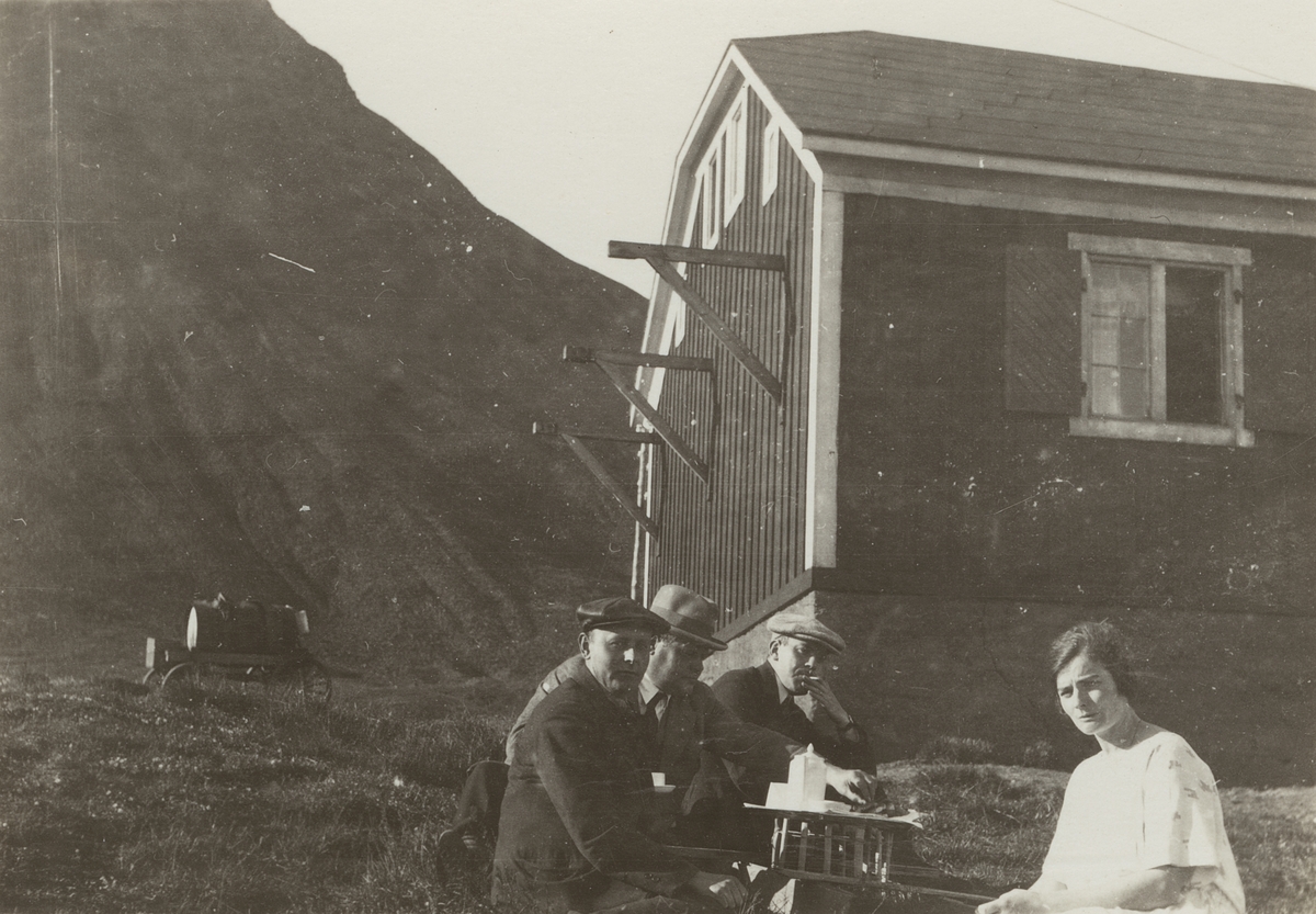 Fotografi från expedition till Spetsbergen. Motiv av tre män och en kvinna som fikar framför ett hus.