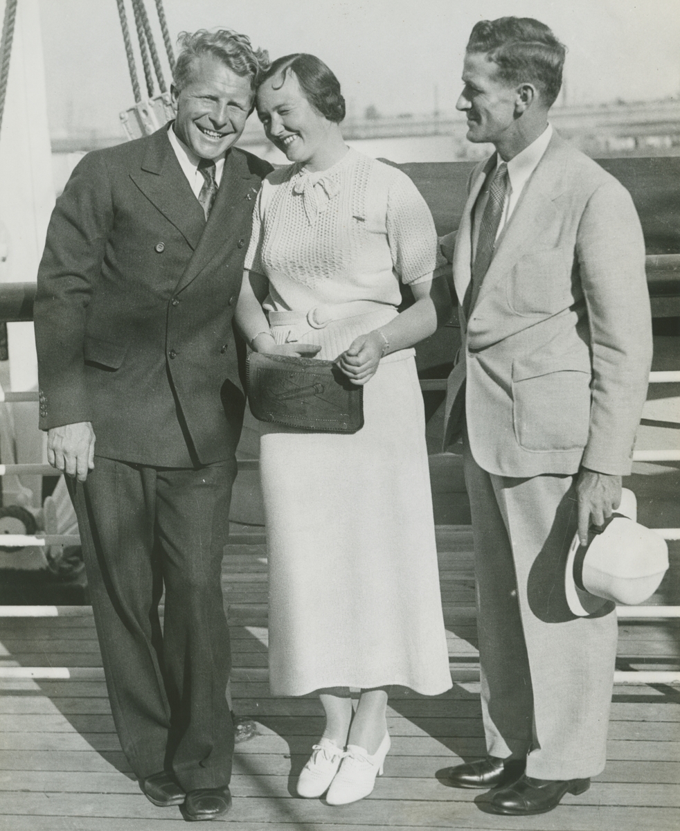 Fotografi från låda märkt Bernt Balchen. Balchen var norsk-amerikansk flygare, polarforskare och militär. Motiv av Balchen, han fru Emmy Sörlie Balchen och man ombord på båt. Balchen står till vänster om kvinnan. Fotografiet är taget 1933.