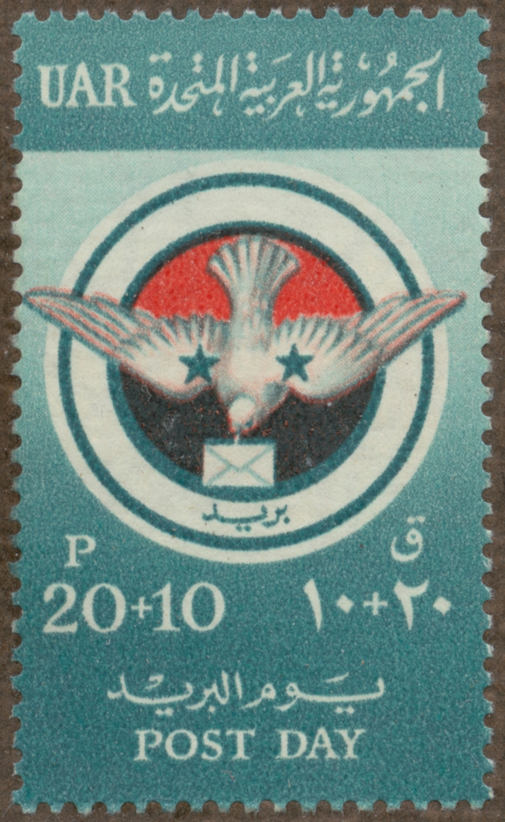 Frimärke från Förenade Arab Republiken, 1958. Motiv av Brevduva -Postens Dag: 20 oktober 1958 -Till förmån för posttjänstemän-