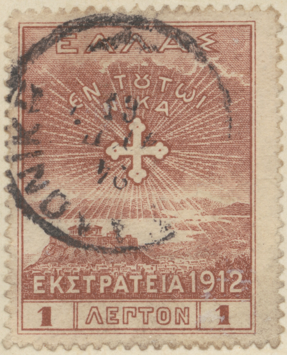 Frimärke från Grekland, 1913. Motiv av Konstantin Kors Symbol I bakgrunden: Acropolis -Grekiska okkupation av en del av Turkiet-