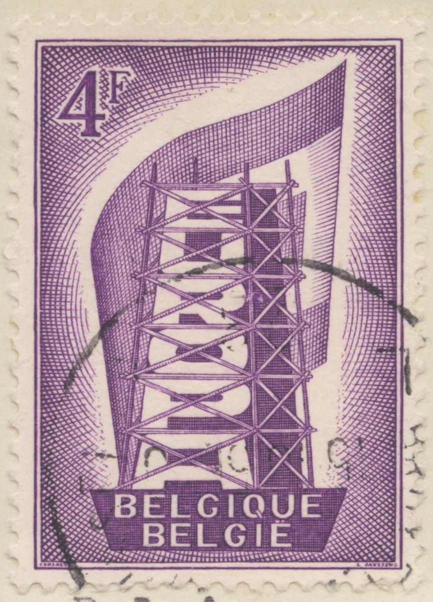 Frimärke från Belgien, 1956. Motiv av Europa Torn Symbolik för samarbete emellan de sex nationerna i Kol- och Stål Unionen.