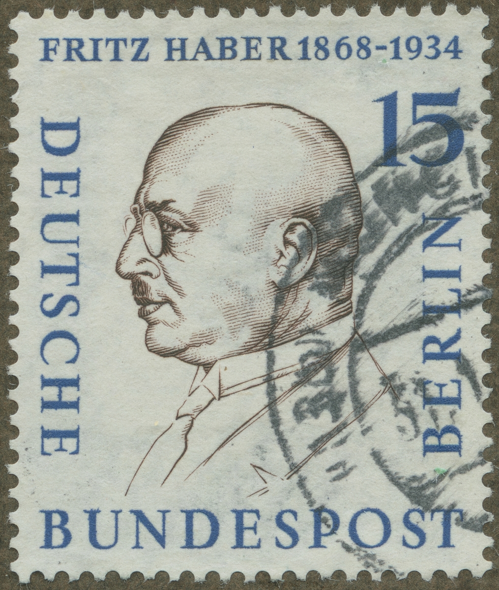 Frimärke från Västtyskland, 1957. Motiv av Fritz Haber: 1868-1934. Tysk kemist. Ammoniaksyntesen. Uppf. stridsgaserna. Nobelpris 1918. "Serie: Eminenta Berlinare."
