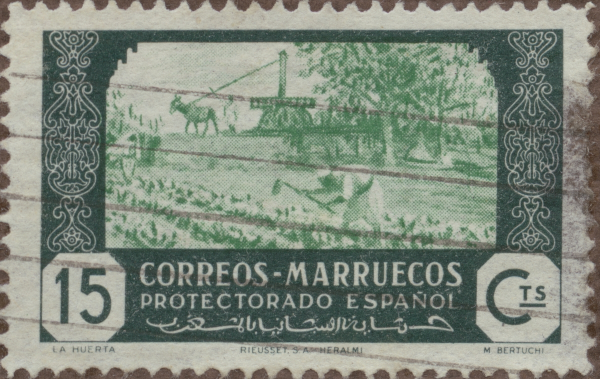 Frimärke från Spanska Marocko, 1944. Motiv av planteringsarbete , köksträdgård.
