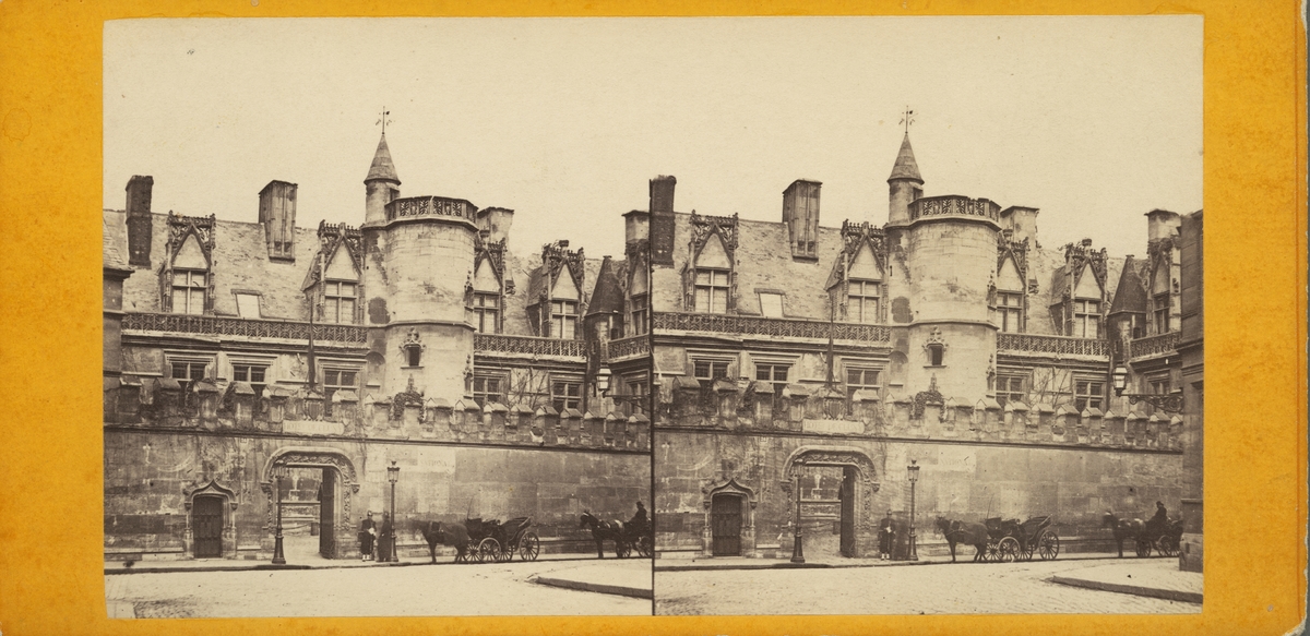 Stereobild med motiv av Musée de Cluny. Framför muren står häst och vagn.