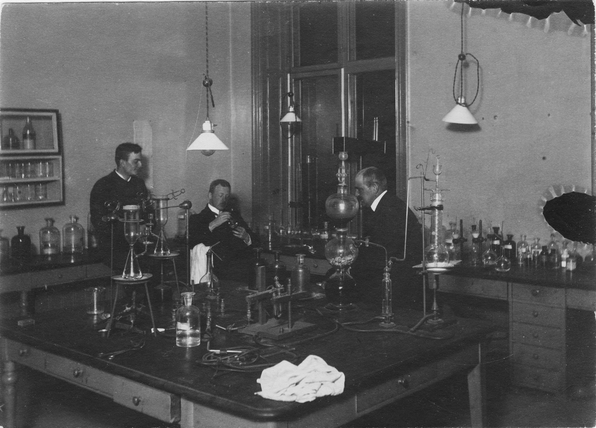 Bångbro Järnverk i Västmanland. Laboratoriet, 1913. Från vänster: Sven Kalling, Hyttingenjör, Ivar Svensson, Kemist och Frans Rickard Stridsberg, Valsverksingejör.