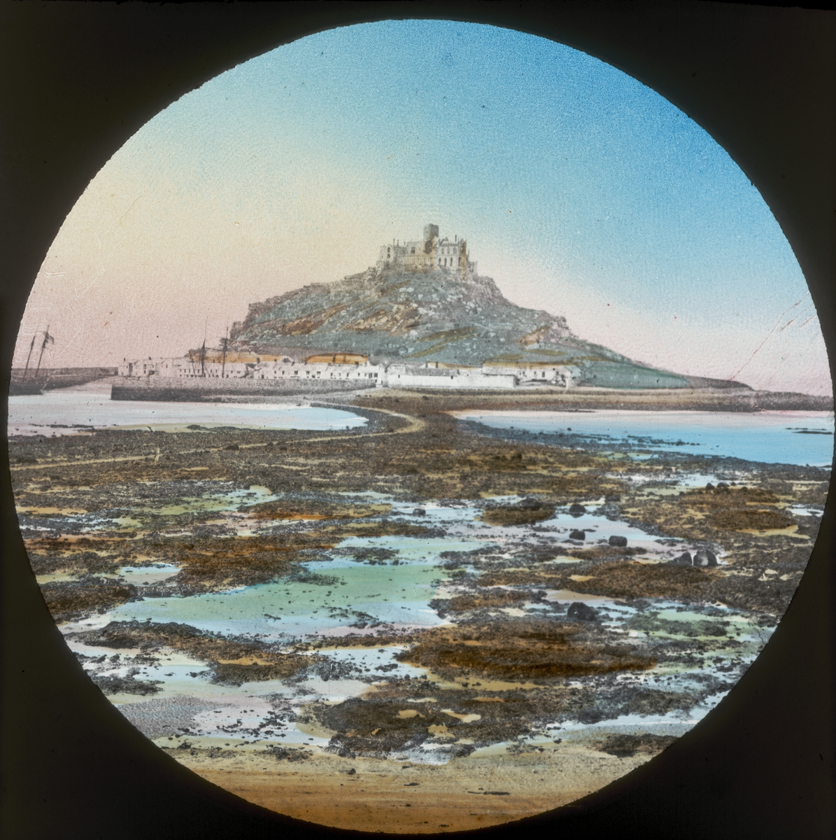 Kolorerad ljusbild för skioptikon med motiv av slott på ö. Möjligen Saint-Michels-Mount, Cornwall, England.