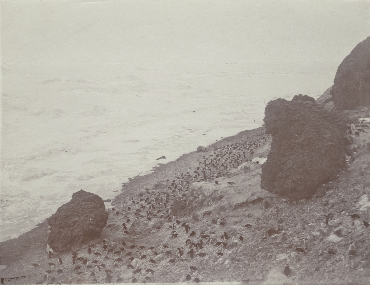 Fotografi från första svenska Antarktisexpeditionen 1901-1904. Motiv av en pingvinkoloni på bergsklippa.