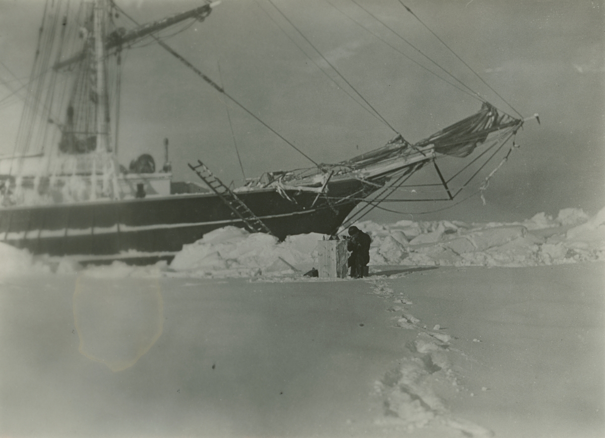 Fotografi från expedition till Grönland. Motiv av stort fartyg, troligen Antarctic. Fartyget har stannat vid ett snötäckt islandskap. En i besättningen har, troligen med hjälp av stegen på bilden, tagit sig ner från båten, sannolikt för att ta bilden med hjälp av självutlösare.