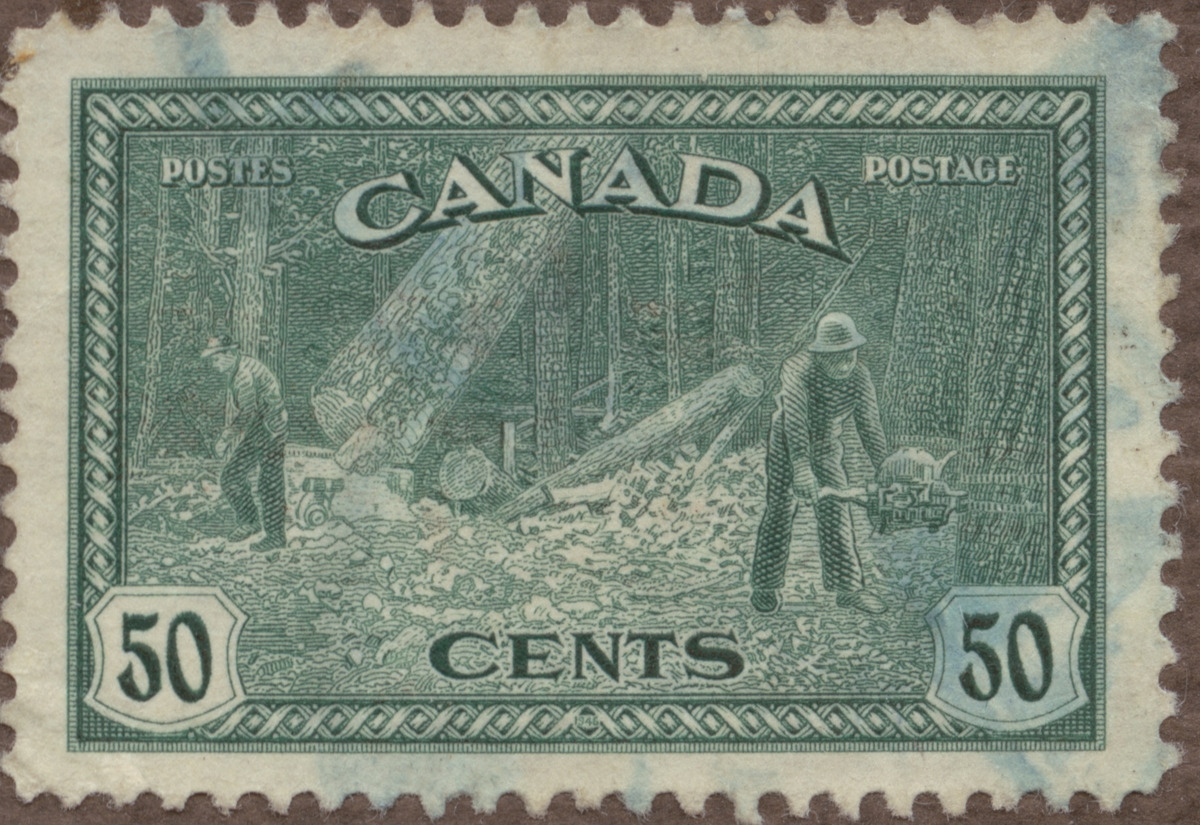 Frimärke från Canada, 1946. Motiv av skogsarbete i provinsen British Columbia.