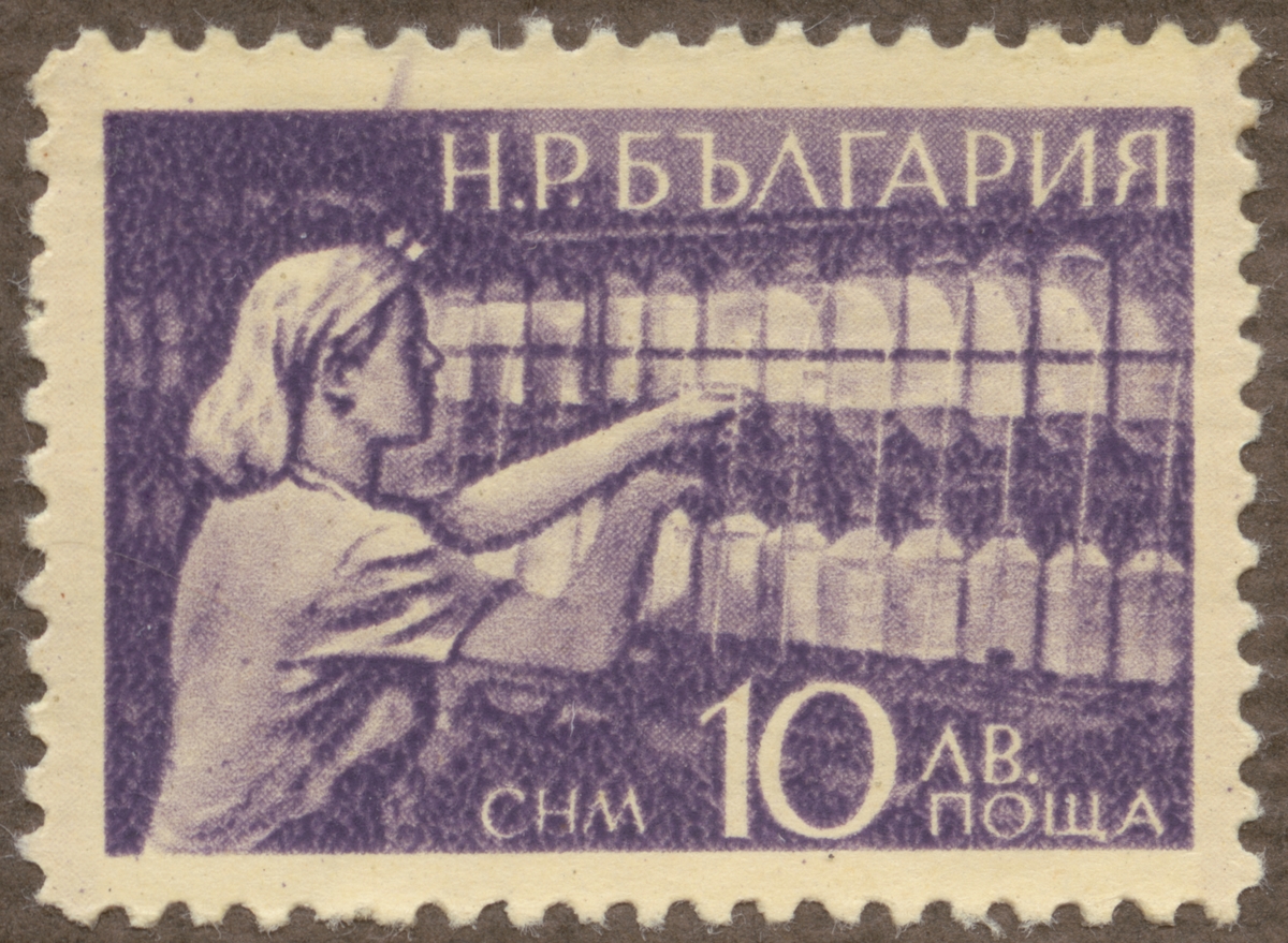 Frimärke från Bulgarien, 1949. Motiv av textilarbetare vid spinnmaskin. "Serie: Honör för unga yrkesarbetare".