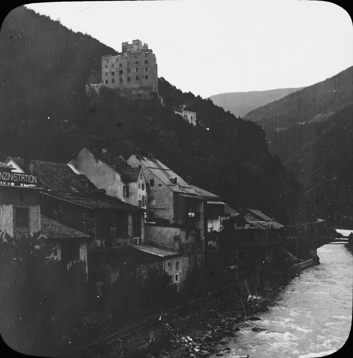 Skioptikonbild med motiv från dalgången Finstermünz vid Landeck, Österrike.
