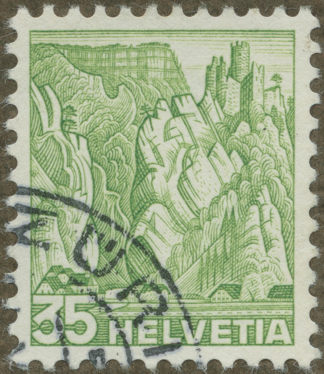 Frimärke ur Gösta Bodmans filatelistiska motivsamling, påbörjad 1950. Frimärke från Schweiz, 1936. Motiv av Lobisey klyftan "och ruinerna av slottet Falkenstein"