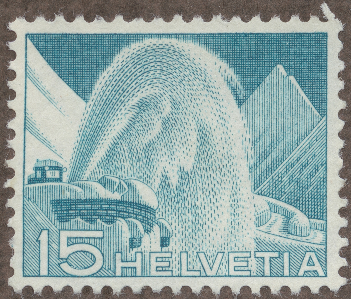 Frimärke ur Gösta Bodmans filatelistiska motivsamling, påbörjad 1950. Frimärke från Schweiz, 1949. Motiv av Snökastarplog för järnväg i Schweiz. "Serie: Teknik och Landskap."