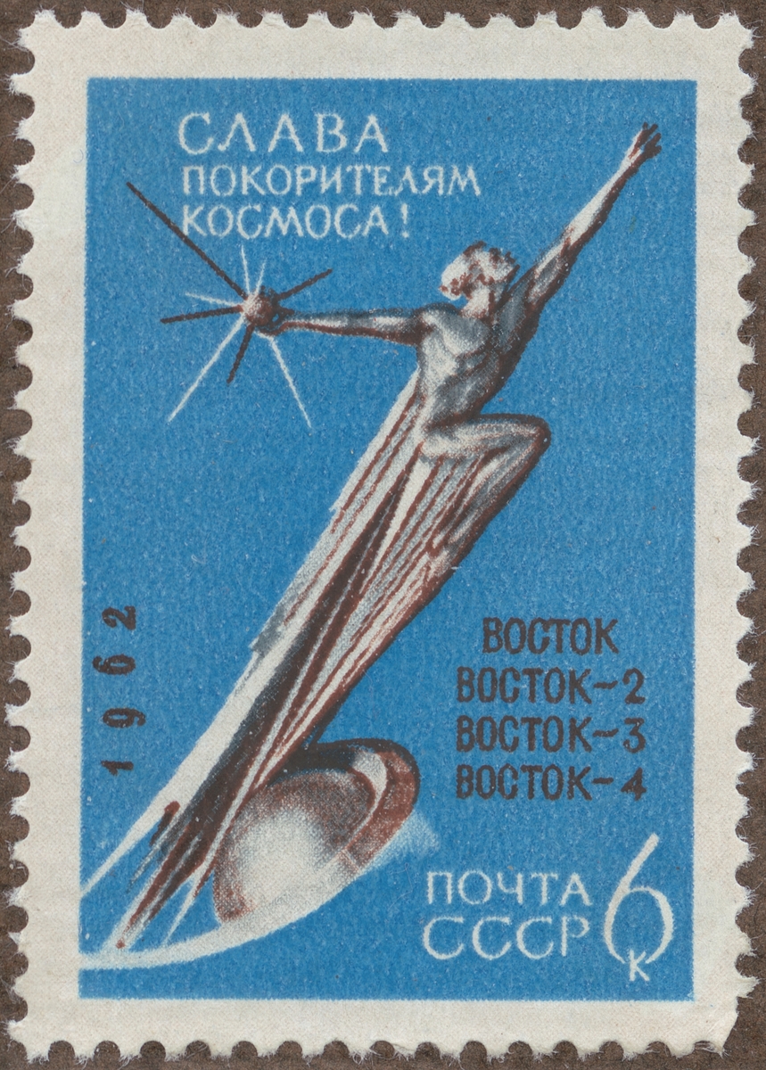 Frimärke från Ryssland, 1962. Motiv av Symbol för astronauten: "Beröm åt kosmosens beskyddare" "-Wostok serie-"