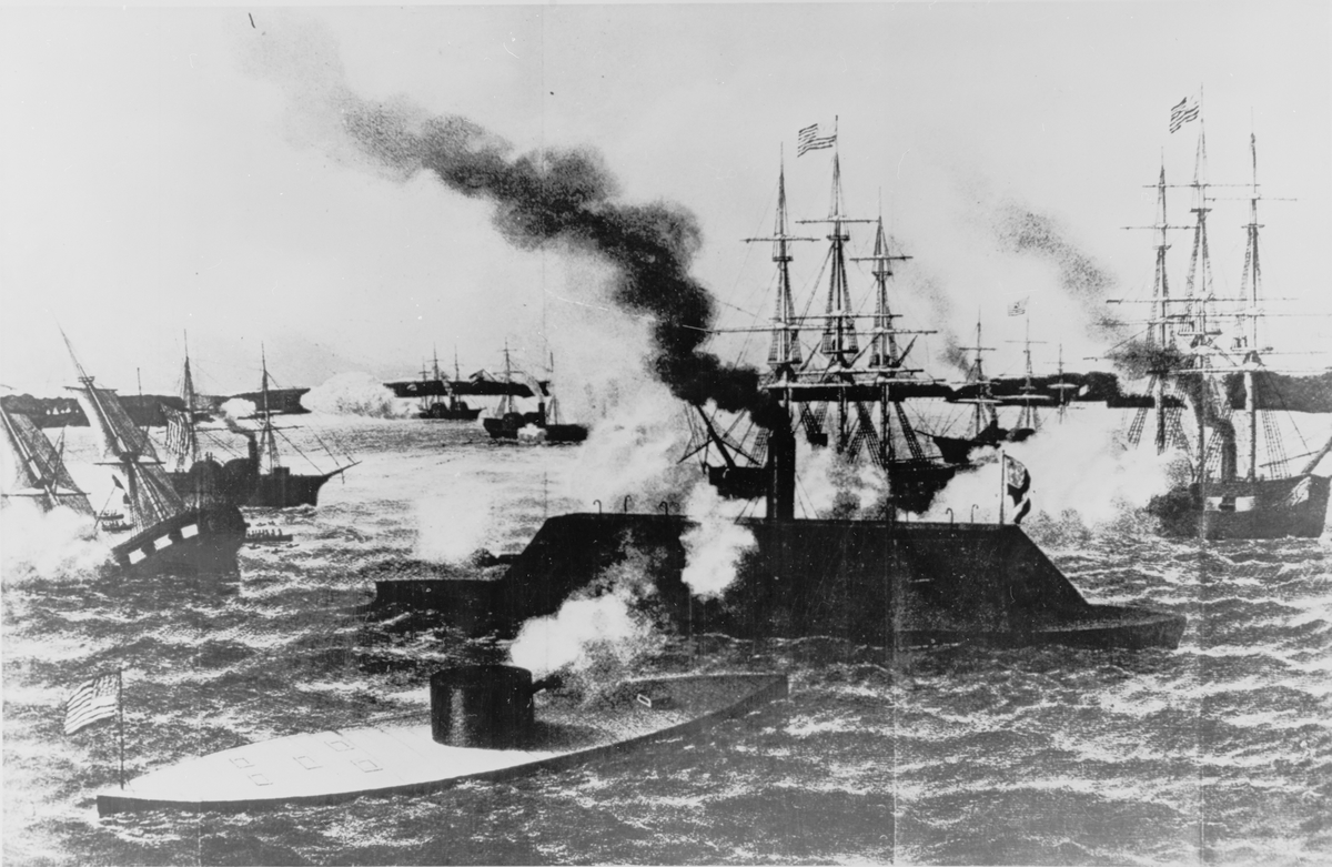 Striden mellan Merrimac och Monitor vid Hampton Roads i Virginia.